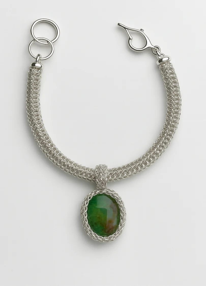 Handwoven Pure Silver Tubular Bracelet with Set Stone PendantThis stunning bracelet is meticulously handwoven with fine pure silver threads, forming a smooth, tubular design that exudes elegance. A beautifully set Andean Opal stone pendant delicately hangs from the piece, adding an exquisite touch of natural beauty.