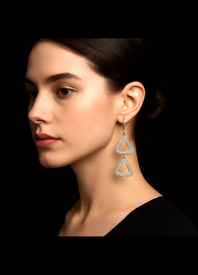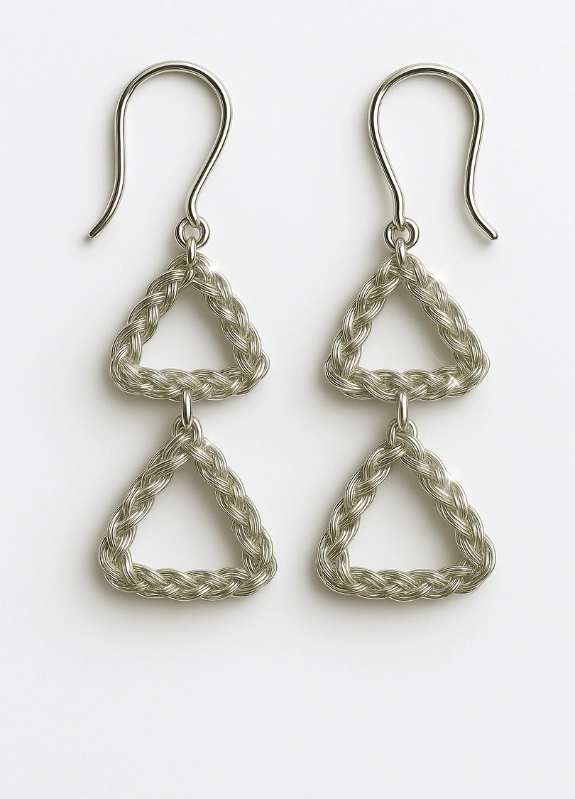 Hand-Woven Pure Silver Thread Earrings with Triangular ShapesThese stunning earrings are expertly crafted with pure silver threads, intricately woven into elegant triangular shapes. The geometric design adds a modern and sophisticated touch, while the fine silver thread ensures a lightweight and comfortable fit.