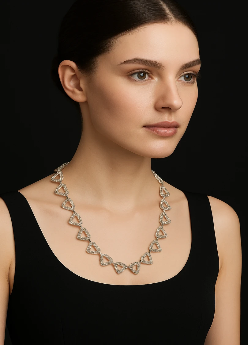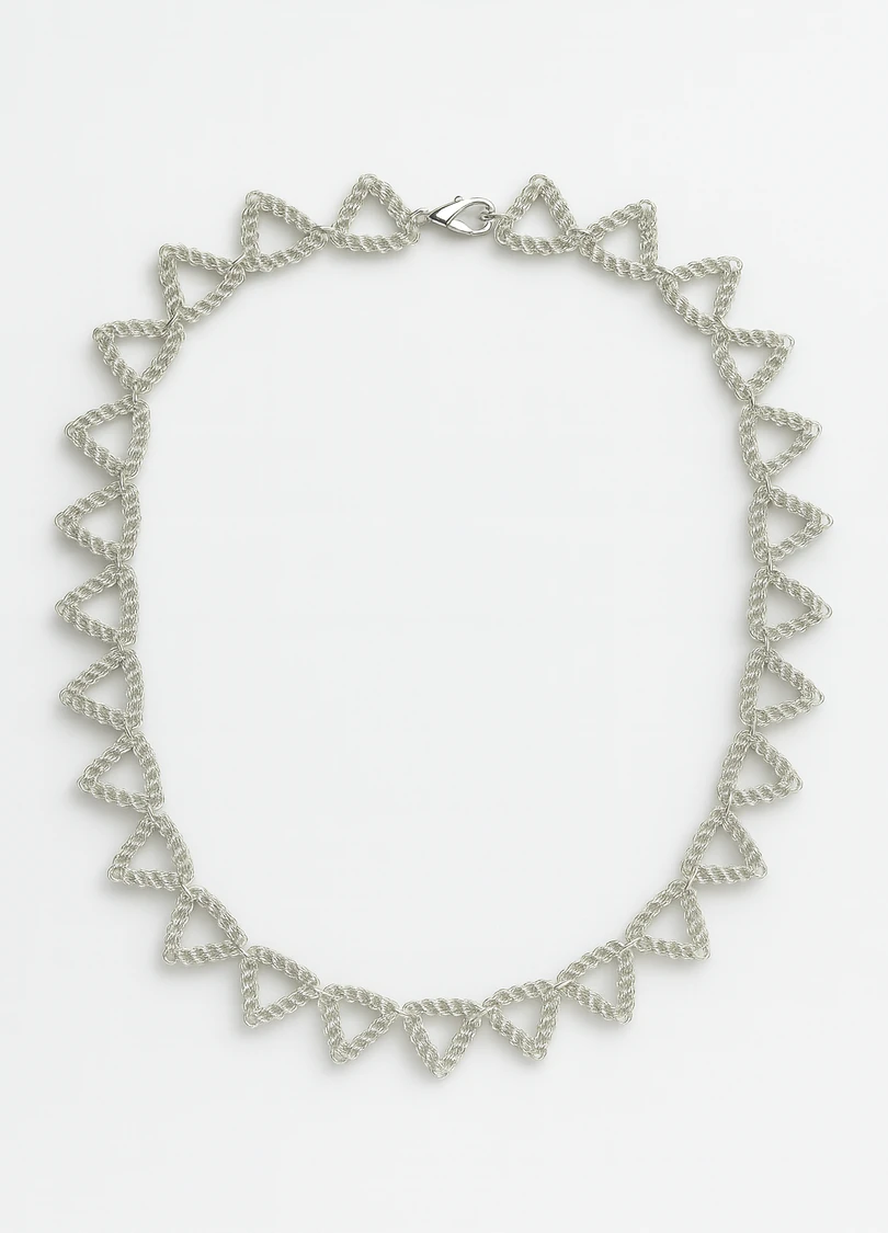 Hand-Woven Pure Silver Thread Necklace with Triangular ShapesThis stunning necklace is expertly crafted with pure silver threads, intricately woven into elegant triangular shapes. Its geometric design gives it a modern and sophisticated touch, while the fine silver thread ensures a lightweight and comfortable fit.