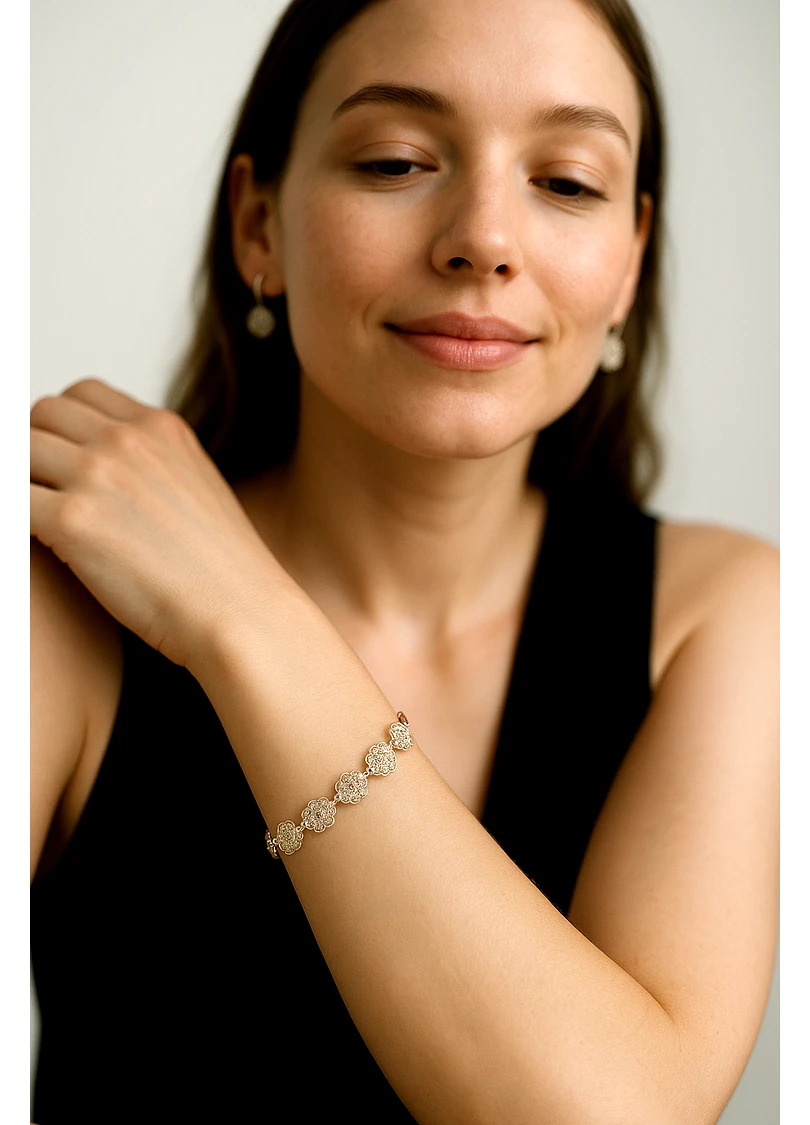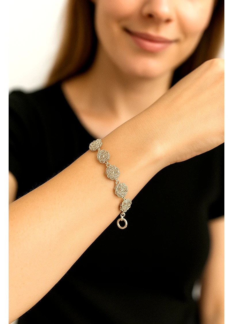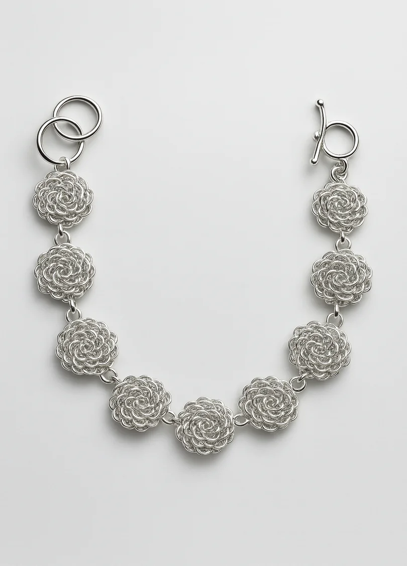 Handwoven Pure Silver Thread Bracelet with Circular ShapesThis elegant bracelet is meticulously handcrafted with pure silver threads, woven into delicate circular shapes. The smooth, fluid design creates a timeless and sophisticated piece, perfect for adding a subtle yet refined touch to any look.