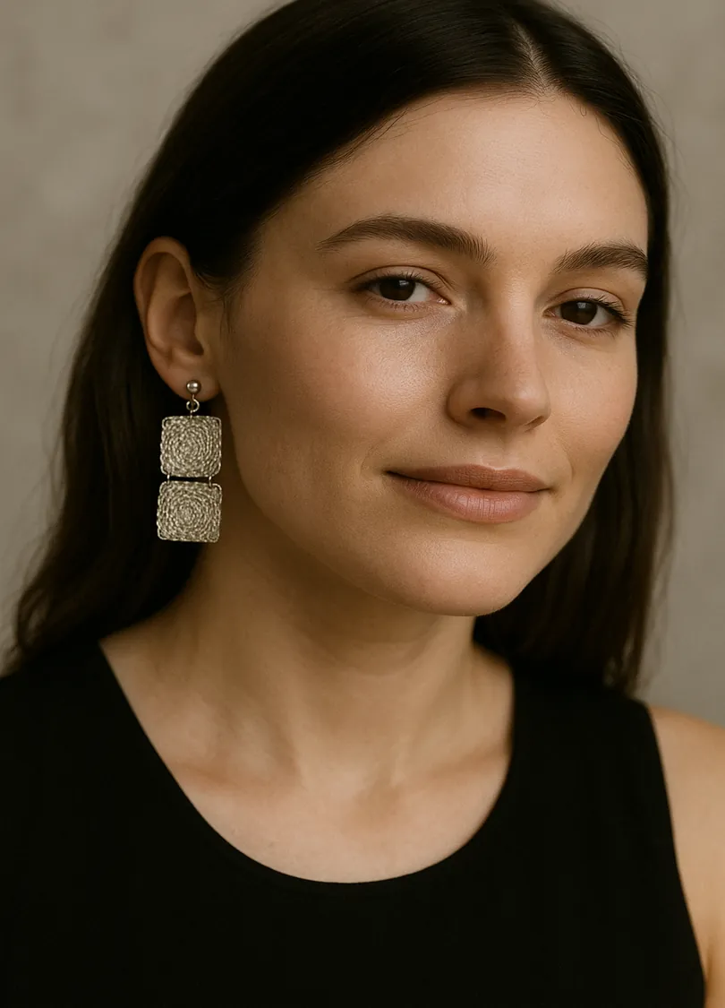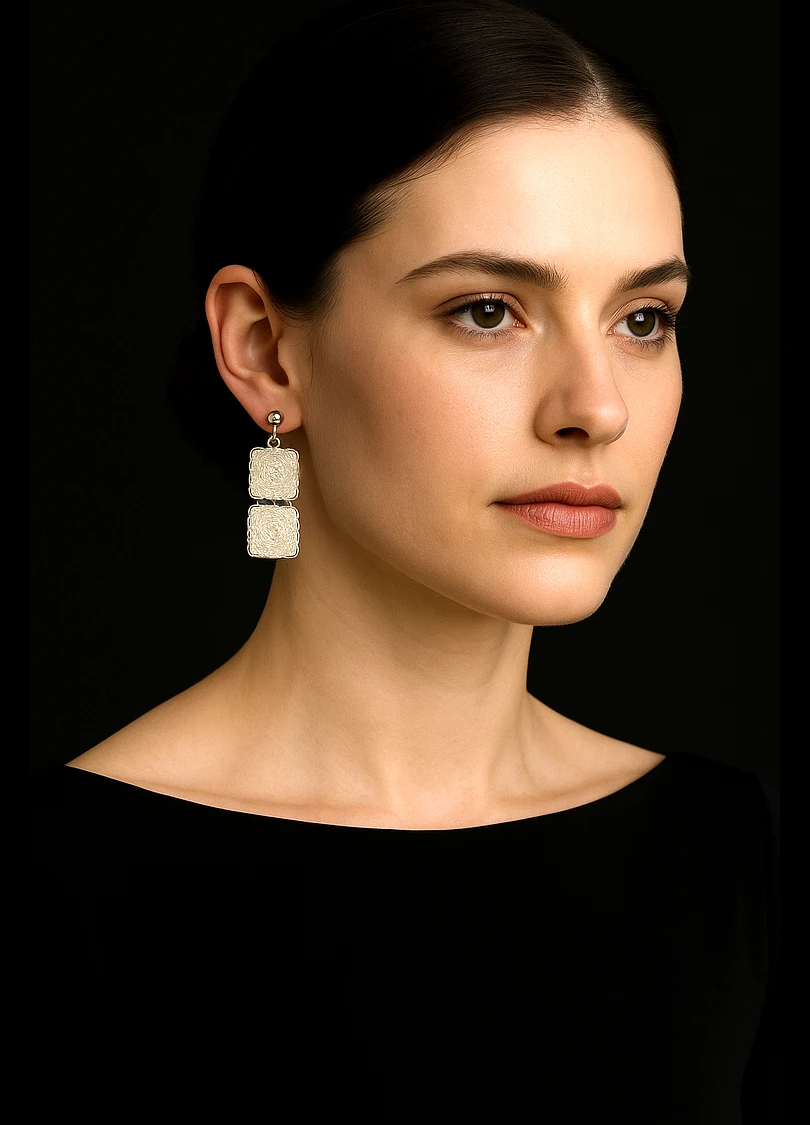 Handwoven Pure Silver Thread square Earrings These beautifully crafted square earrings are handwoven with fine threads of pure silver, showcasing exceptional artisanal skill.