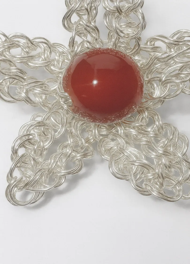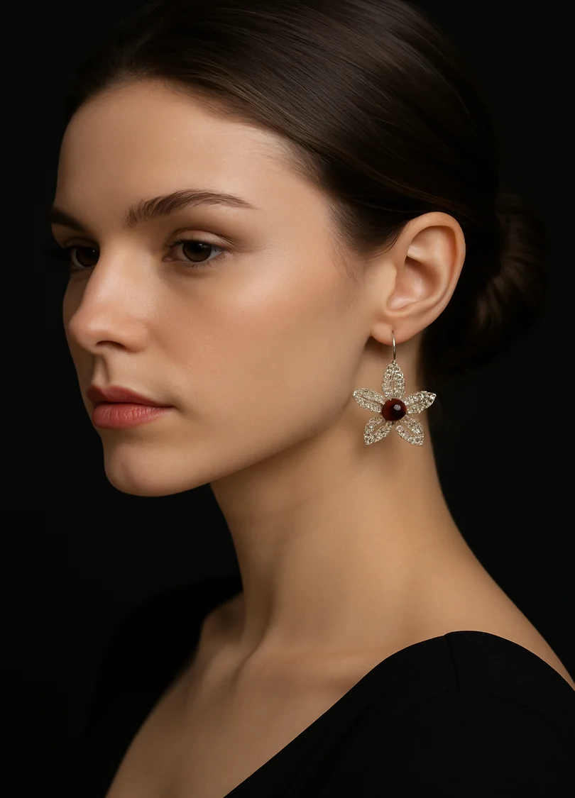Handwoven Silver Flower Earrings with Natural Stone CenterThese exquisite earrings are designed in the shape of a delicate flower, expertly woven with pure silver threads. At the heart of each bloom lies a stunning natural brown opal stone, adding an organic touch and unique character to each piece.