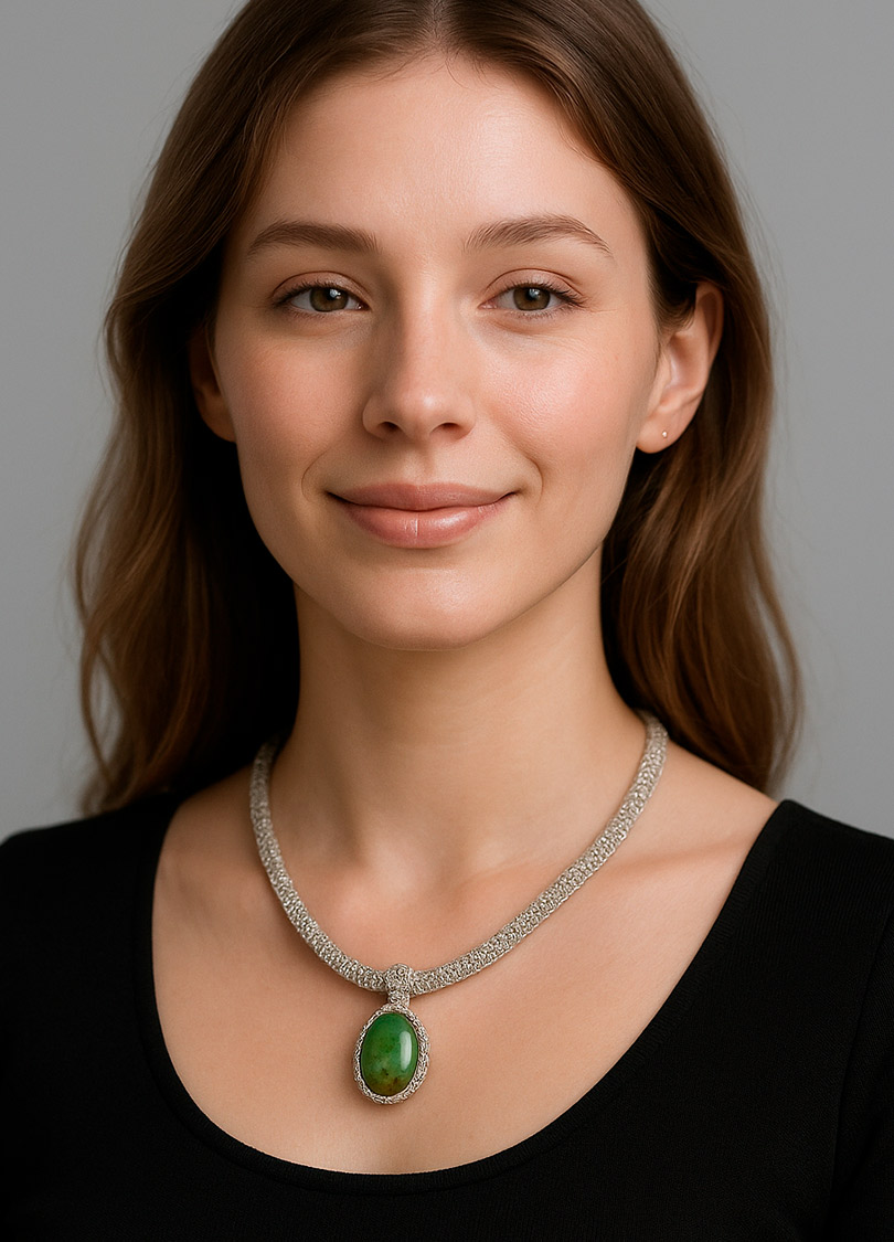 Handwoven Tubular Silver Necklace with Natural Stone Pendant| This exquisite necklace features a delicately handwoven tubular design made from pure silver threads. The elegant, textured silver seamlessly complements a stunning natural stone pendant, creating a beautiful contrast between the smoothness of the metal and the raw beauty of the stone. Perfect for adding a touch of organic elegance to any outfit, this necklace effortlessly combines artisanal craftsmanship with timeless style. |