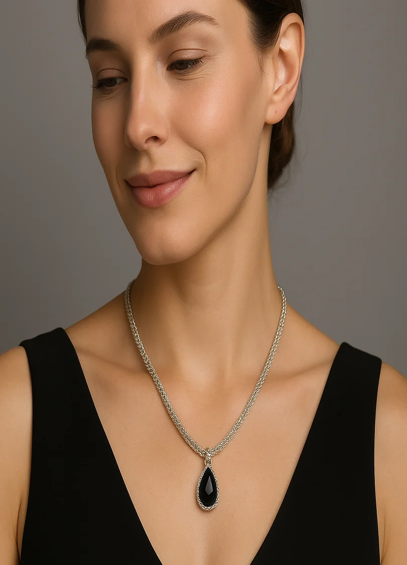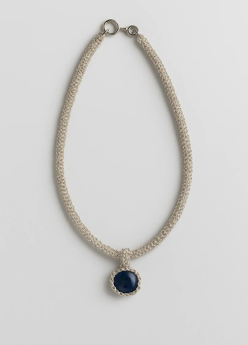 Handwoven Tubular Silver Necklace with Natural Onix Stone PendantThis exquisite necklace features a delicately handwoven tubular design made from pure silver threads. The elegant, textured silver seamlessly complements a stunning natural Onix stone pendant, creating a beautiful contrast between the smoothness of the metal and the raw beauty of the stone. Perfect for adding a touch of organic elegance to any outfit, this necklace effortlessly combines artisanal craftsmanship with timeless style.